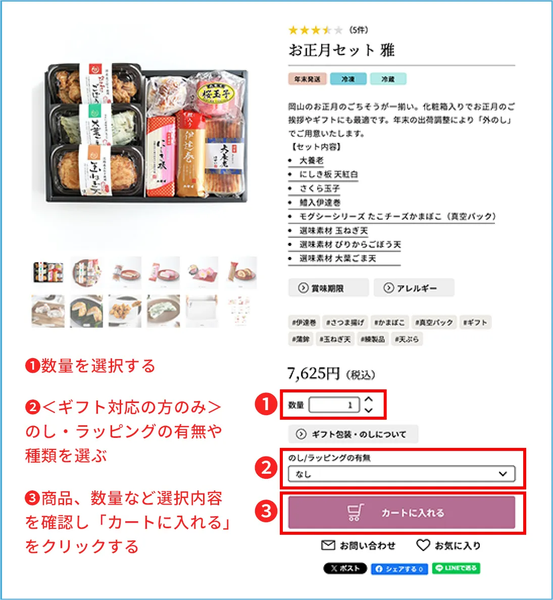 ご購入する商品を選び、ギフト対応の方は、のしやメッセージカードを選択してから、「カートに入れる」のボタンをクリックしてください。