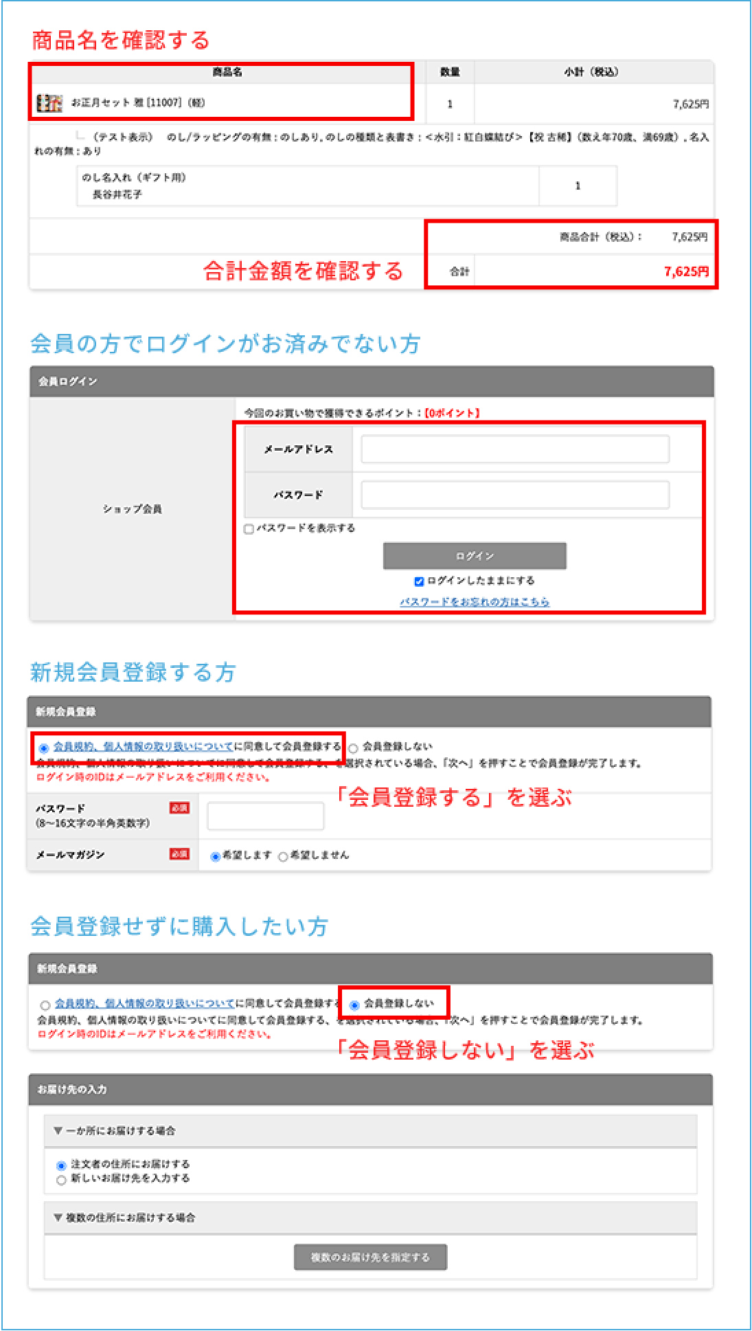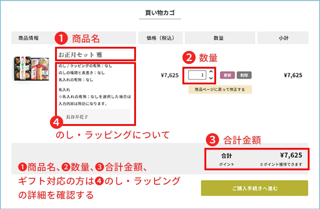 カートにて購入した商品の内容、数量、ギフト包装やのしについて、ご確認ください。