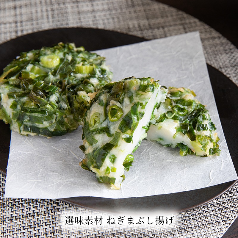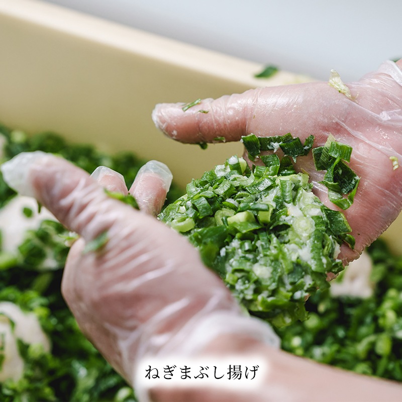 香味豊かな国産青ねぎをたっぷりまぶし、中にも外にもねぎを贅沢に使って柔らかく仕上げた「ねぎまぶし揚げ」。ねぎの爽やかな香りと旨味が、すり身のやさしい甘みと調和し、一口ごとに風味豊かな味わいを楽しめます。