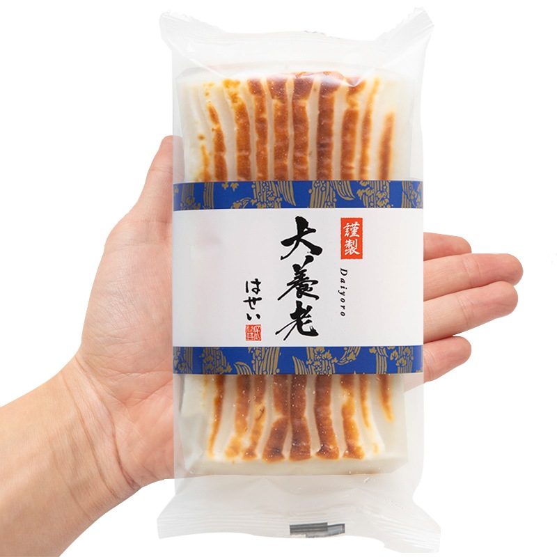 創業当時から作られている長寿を願う”養老の滝”を写したおめでたいかまぼこ「大養老」。上等なすり身を使い、筋目の焼きの香ばしさ、濃厚な旨み、心地よい食感と歯切れの良さ、バランスの良いお品物です。岡山では、特上うす板と同様に親しまれている蒲鉾です。切り口の美しさも格別で、うどんやそばの彩りはもちろん、板わさとしてもお楽しみいただけます。ダンボール箱でのお届けです。 →化粧箱入り