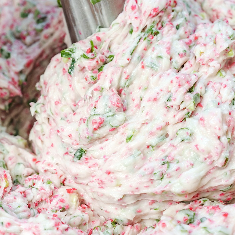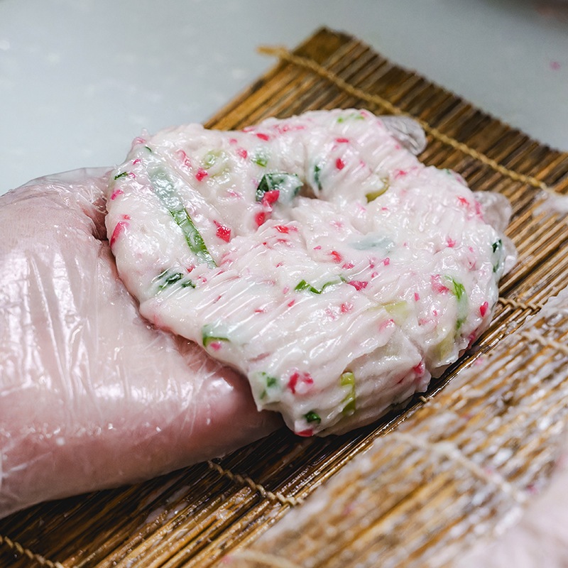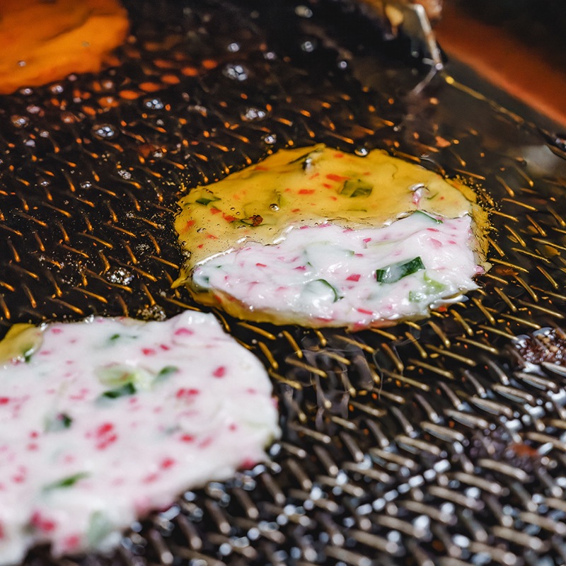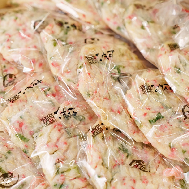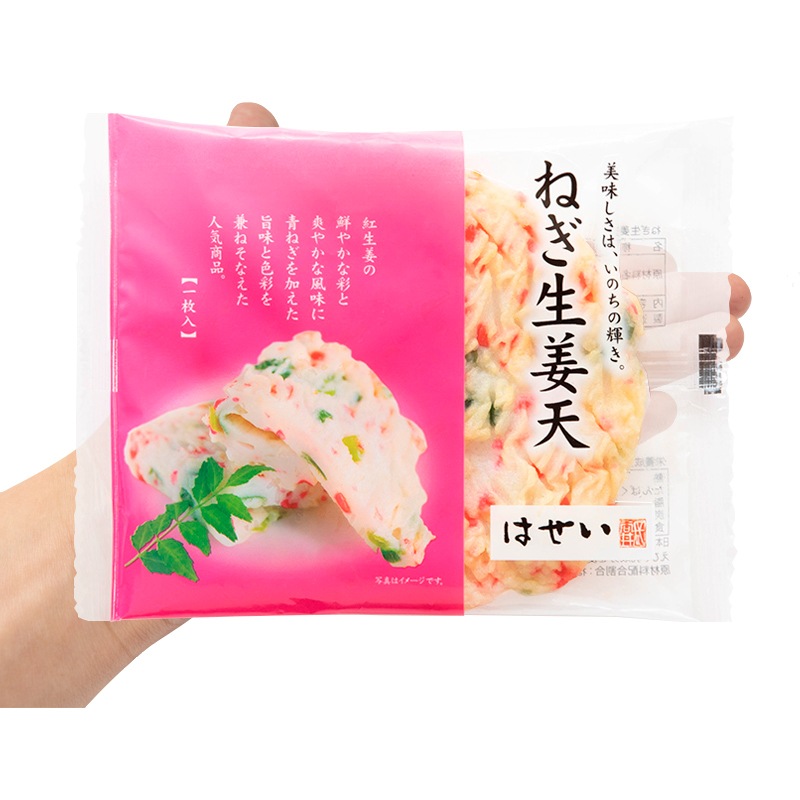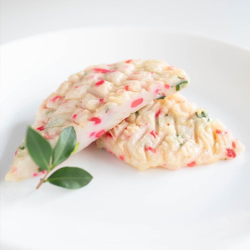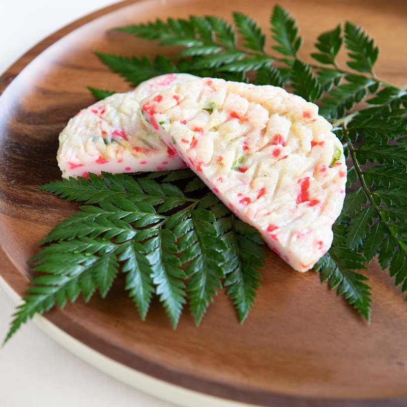 上質なすり身の旨味に、青ねぎの豊かな香りと、紅しょうがの爽やかな辛味をほどよく調和させた「ねぎ生姜天」。白地の生地に、赤と緑が映える彩りの美しさも魅力で、食卓を華やかに演出します。