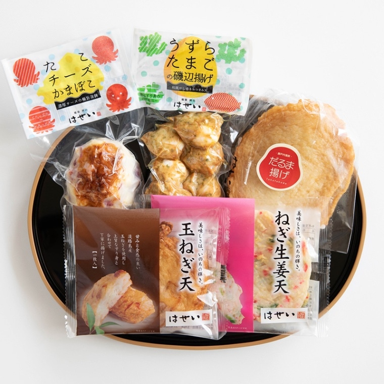 ●だるま揚げ 2枚入り 1袋はせい人気No.1の「玉ねぎ天」を中心に、定番のさつま揚げを詰め合わせた上品なギフトセットです。一つひとつ丁寧に手作りされたさつま揚げは、贈り物としても喜ばれます。手作りならではのやさしい味わいは、慶びの席にも、故人を偲ぶ場にもそっと彩りを添えます。お一人様でも楽しめるサイズ感で、どなたにも贈りやすいのが魅力です。落ち着いた佇まいは、慶弔両用として安心してお使いいただけます。エコ素材のギフトボックスに収めてお届けする、心遣いが伝わる上品な一品です。