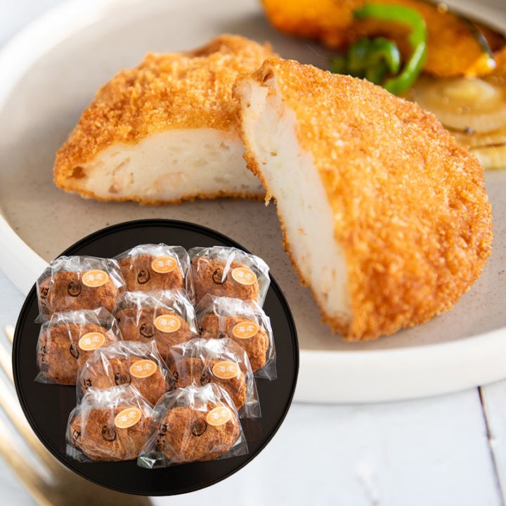 ●えび魚ろっけ 10個岡山県最大の朝市”京橋朝市”名物「魚ろっけ」(ぎょろっけ)に、プリプリの小えびを入れました。ふわふわのすり身、サクサクの衣が楽しめるお魚コロッケがたっぷり10個入ったセットです。甘い玉ねぎとピリッと胡椒がアクセント。トースターやグリルで衣をカリッと焼くとさらに美味しい。ビールのおつまみにも最高です。