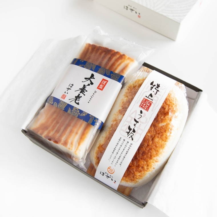 岡山名物焼き蒲鉾「特上うす板」と、末広がりで養老の滝を映した縁起のよいかまぼこ「大養老」。”はせい”を代表するかまぼこをギフトセットに。化粧箱入り、慶弔両用ギフト。 →特上うす板2枚箱入