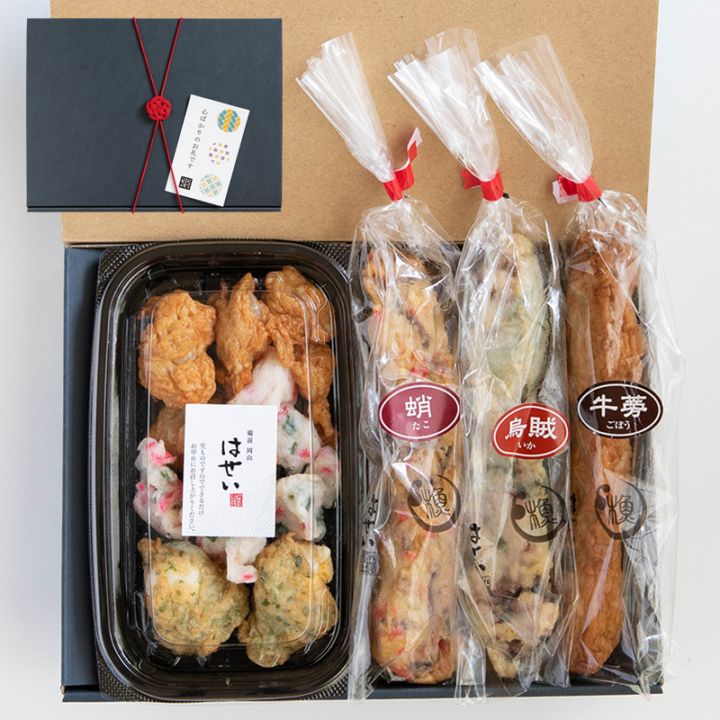 ●棒天タコ紅生姜 1本<期間限定発送1月末まで>一口サイズの「ちぎり天」3種(ピリ辛ごぼう・ねぎ生姜・うずら卵磯辺揚げ)と、ガブッと食べ応えのある職人が丁寧に手握りした「棒天」3種を詰め合わせました。魚の旨みをそのままに、一本一本を丁寧に仕上げた「手にぎり棒天」。ごつごつとした手作りの食感と、じんわり広がる深い味わい。岡山駅でもお土産や新幹線飲みのお供に人気の品です。晩ごはんのおかずに、晩酌のおともに、みんなで分けてもひとりでパクッと食べても大満足。気軽に楽しめる人気のセットです。新鮮な油を使用しておりますので、冷たいままでお召し上がりいただけます。カジュアルギフトに最適です。エコギフトボックス入り。慶弔両用ギフト